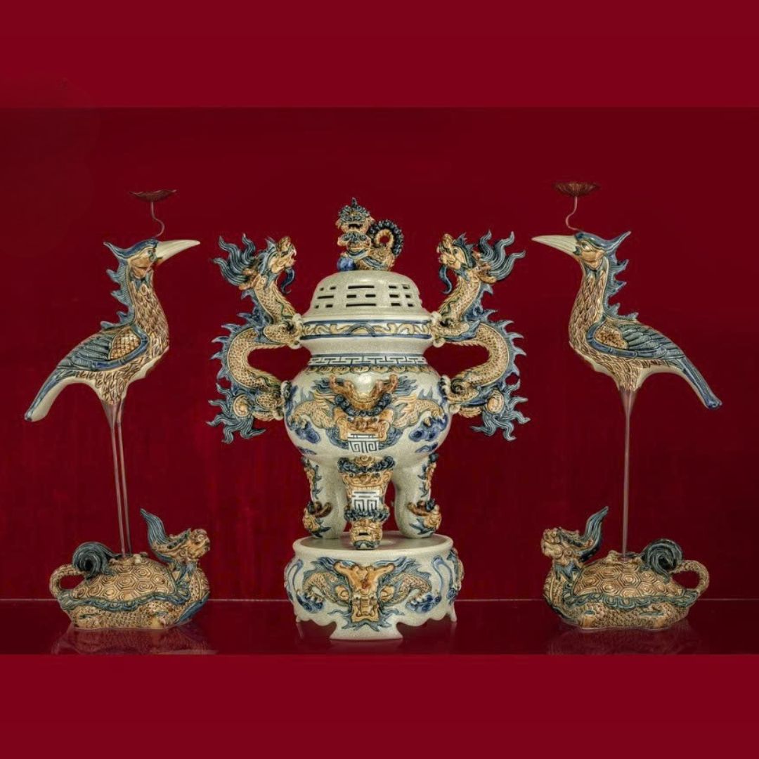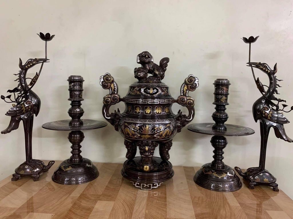 Gồm: 1 Đỉnh thờ + 2 Hạc thờ + 2 Chân nến. (Tức là đầy đủ các thành phần).